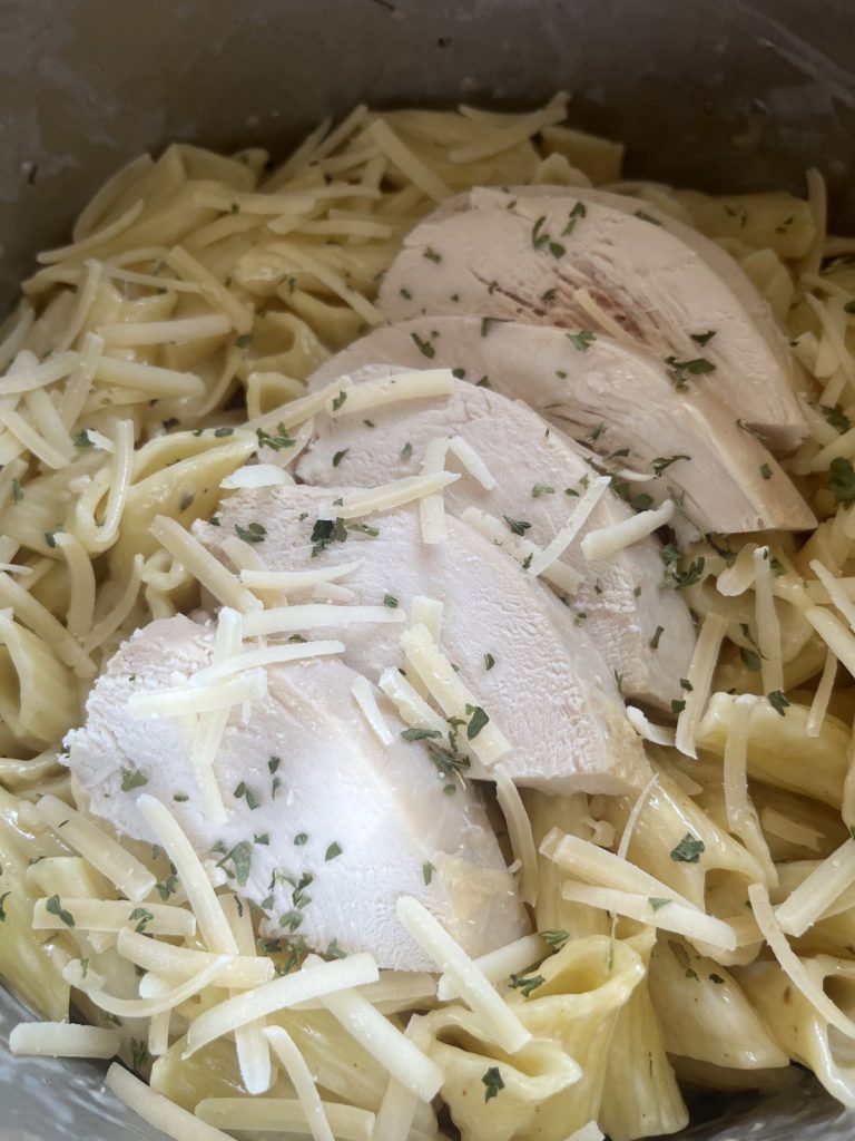 Pour the sauce over the cooked pasta, add the cooked chicken, and toss until everything is evenly coated. Serve warm.