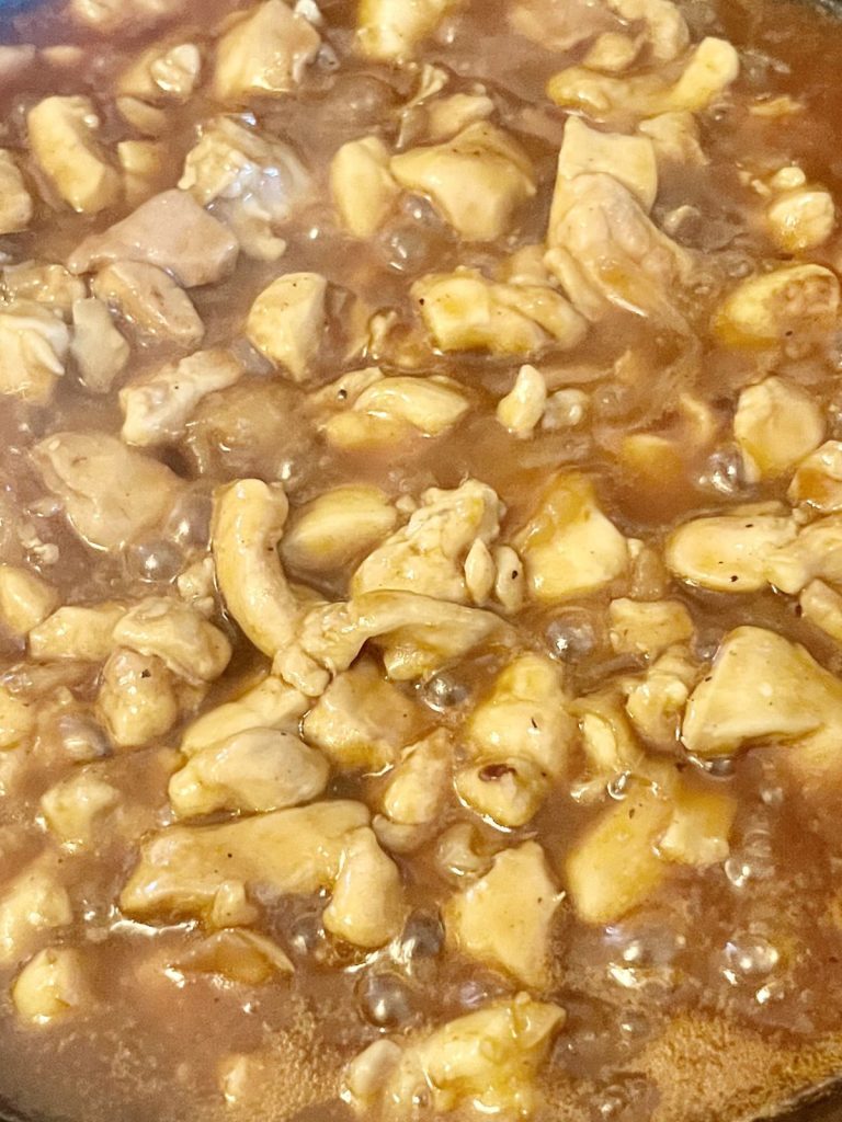 Once the meat is browned, add 1c of barbecue sauce, 1/4c honey, 2T soy sauce or cocoa aminos. Stir and cook for 3-5 minutes until it starts to thicken.