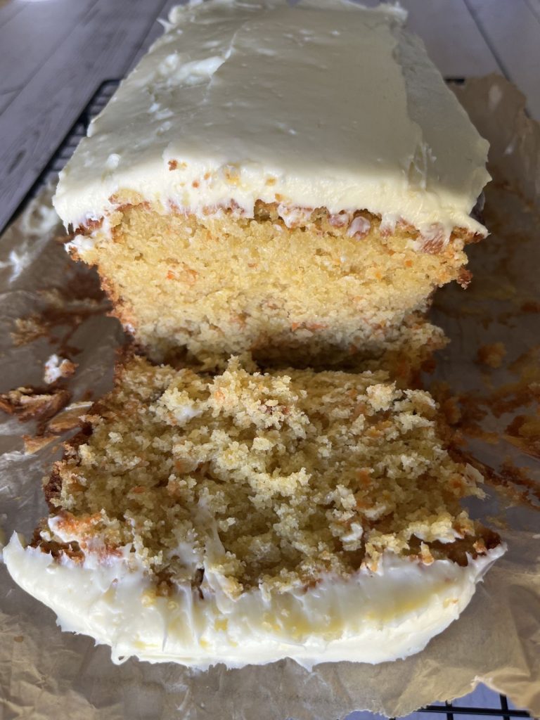 While the loaf cools, mix the cream cheese frosting. Once the loaf has cooled, slather on the frosting and serve.