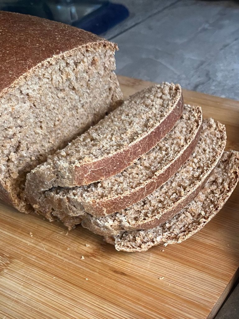 Cool. Once it’s done baking, use a hot pad to take the pan out of the oven and let the loaf cool in the pan fro 30 minutes to 1 hour before dumping it out. The middle of the loaf is still filled with steam and if you cut into it right away, it will be a little doughy. It won’t be doughy after 30 minutes, just very hot. You can slice into it at this point if you would like hot bread, but like I said it will still be hot.